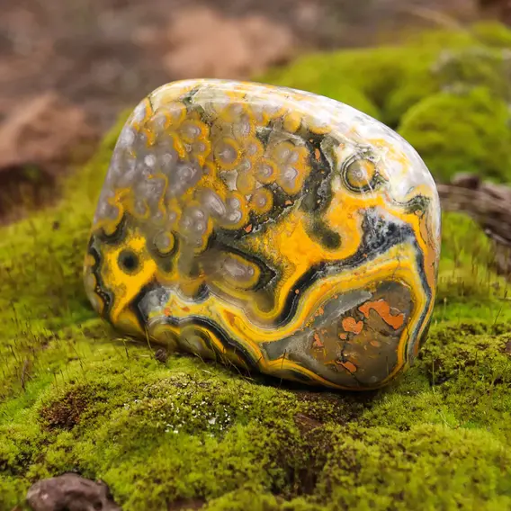 Bumblebee Jasper is not a “true Jasper” as it is a rare limestone, made of calcite and volcanic ash. The white/gray color is Calcite, the yellow/orange color is Realgar (not sulfur), and the black layers are Pyrite. The rock does contain trace amounts of Sulfur but has been lab-verified as Realgar (Attard and Petrov, 2017).